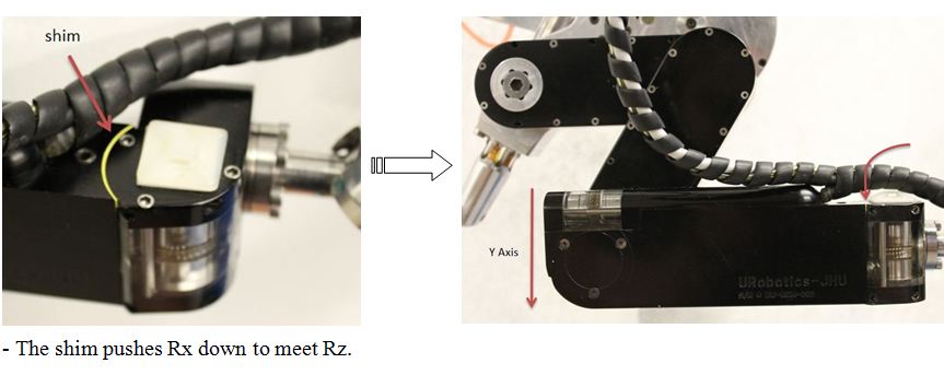 As it currently stands, there is a small but noticeable error ( 3mm ) in the location of the RCM. The RCM’s two axes of rotation are neither perpendicular nor intersecting, which causes it to move upon revolving either axis. This completely defeats the purpose of having an RCM, which offers the benefit of having a stationary pivot point around which it is possible to work. Since any error in the location of the RCM will cause even more errors to propagate along the linkage of the robot, a small displacement in the location of the RCM could lead to a very large displacement in the tip of the surgical device attached.
